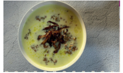 Rashoof is a traditional dish from Jordan. To prepare it, start by chopping onions and frying them in a pan. Then add lentils and cracked wheat. People sometimes also add rice. Cook in boiling water. Add a special yoghurt called jameed and cook until the mixture becomes thick and creamy. Serve it with crispy fried onions on top. People love to eat this in winter!