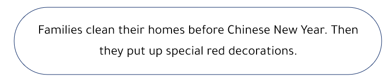 In China, the New Year starts in January or February. Many people celebrate for two weeks! They eat lots of tasty food. Families often make dumplings together on New Year’s Eve. You make them with meat or vegetables and very thin dough. Then you boil the dumplings in water.