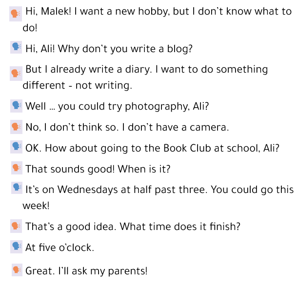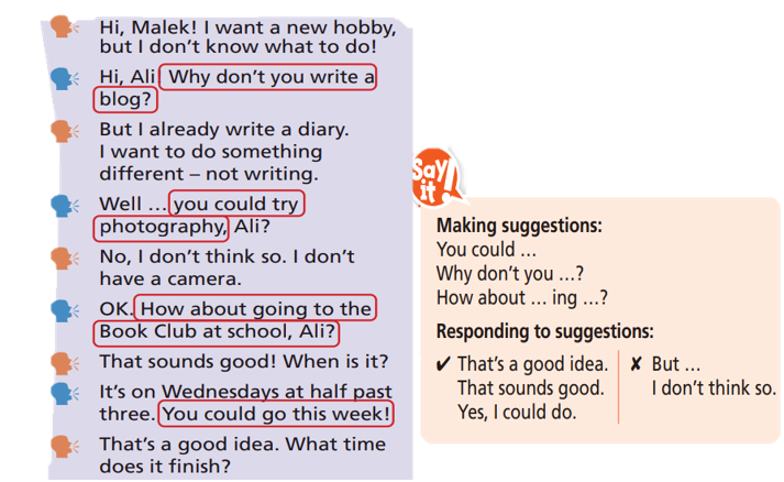 2 Read the dialogue again. Find and write four suggestions that use language from the Say it! box.