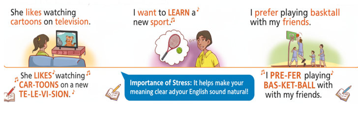 - Nouns and verbs that tell what the activity is are also stressed to make the sentence clear.