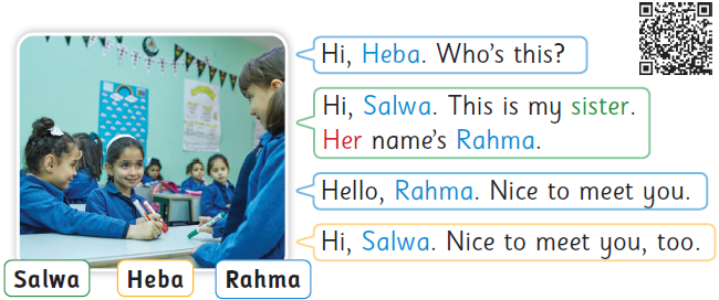 👩‍🏫 (مرحبًا يا هِبَة. مَن هذه؟)
