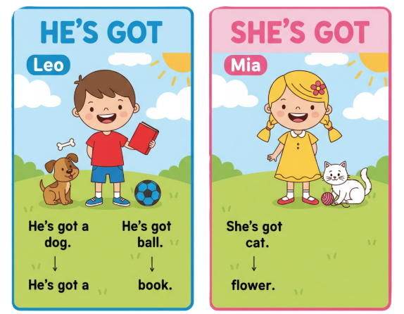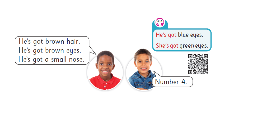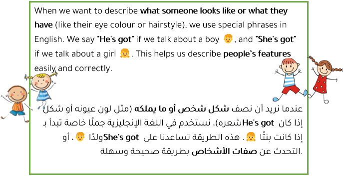 بعدها نضيف الصفة أو الشيء الذي لديه/لديها (مثل: eyes, hair, nose...)