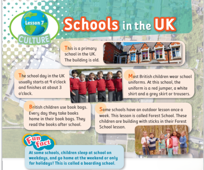The school day in the UK usually starts at 9 o’clock and finishes at about 3 o’clock.