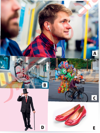 2 S1: two exceptional-looking people: the old-fashioned British man, the man with the gold suit; S2: a pair of women’s shoes in decent condition; S3: a mass of brightly coloured balloons, fastened to a bike