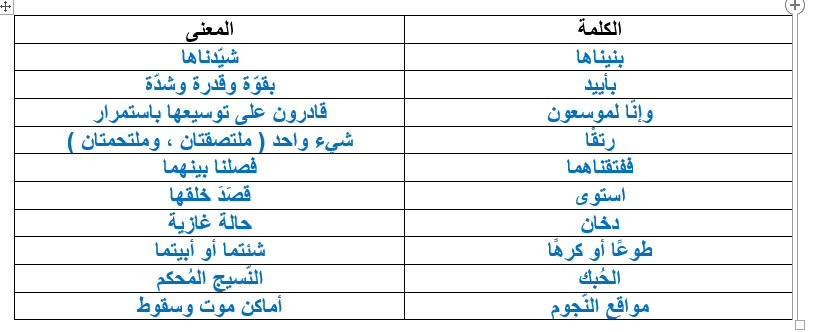 الفكرة الرّئيسة : الآية الكريمة تثبت أنّ الكون في توسّع مستمر ، واكتشافُ العلماءِ أنّ السّماء بناء محكم التّشييد دقيق التّماسك والتّرابط.