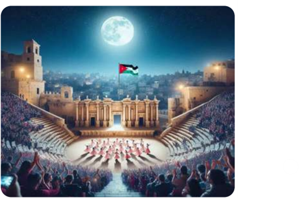 جمهورٌ غفيرٌ يشاهد العرض، وأطفالٌ يؤدّون الرقصات، والعَلم الأردني يرفرف فوق المدرّج، والمدينة مضاءة خلفه.