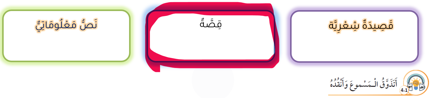 أُلَوِّنُ إِطَارَ الشَّكْلِ الَّذِي يُمَثِّلُ نَوْعَ النَّصِّ الَّذِي اسْتَمَعْتُ إليه: