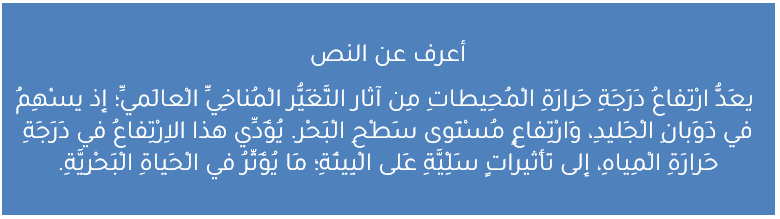 أَخَذَ ثامِرٌ يَقْرَأُ: تَعيشُ بَعْضُ الْكائِناتِ الْبَحْرِيَّةِ في مِياهِ الْبَحْرِ، وَتَظَلُّ في نِطاقِ مُعتَدِلٍ نسبيًَا مِنْ دَرَجَةِ الْحَرارَةِ مُقارَنَةً بِالظُّروفِ الْمُتَطَرِّفَةِ لِلْبيئاتِ عَلى الْيابِسَةِ. وَقَدْ نَسأَلُ: كَيْفَ تَكونُ الْحَرارَةُ في الْمُحيطاتِ؟