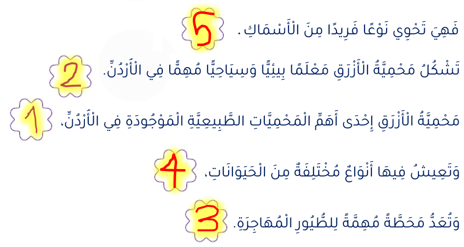 أَكْتُبُ الْفِقْرَةَ بِتَرْتِيبِ الْجُمَلِ السَّابِقَةِ، مُنْتَبِهًا لِتَوْظِيفِ عَلَامَتَيِ التَّرْقِيمِ: (،) وَ (.). وَكِتَابَةِ عُنْوَانٍ مُنَاسِبٍ، وَتَرْكِ مَسَافَةِ بِدَايَةِ الْفِقْرَةِ: