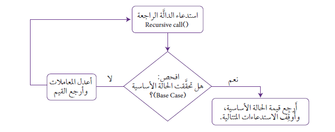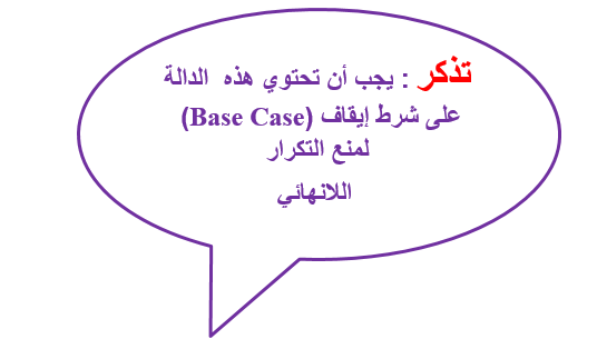 base_case:القيمة الأساسية التي تجعل الدالة تتوقف عن العمل، وعدم وجودها يعني ان البرنامج يوف يدخل في حالة دوران لا نهائي.