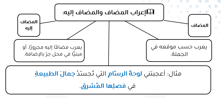 فنلاحظ أنّ كلمة (كتاب) قد ضُمّت إلى كلمة (الطالبِ) وكلا الكلمتين تحملان معنى خاص بهما، لكن عند ضمّهما إلى بعضهما فإنّهما يكتسبان معًا معنى جديدًا لم يكن موجودًا قبل التركيب، ويُسمّى هذا التركيب بالإضافةً؛ لأنّ الاسم الأول (المضاف) يحتاج إلى الاسم الثاني (المضاف إليه) لإتمام المعنى المقصود، فلا يُفهم المقصود إلا إذا اجتمعا. ولنتعرف أكثر على الإضافة تتبع تأمل النموذج الشعري الآتي: