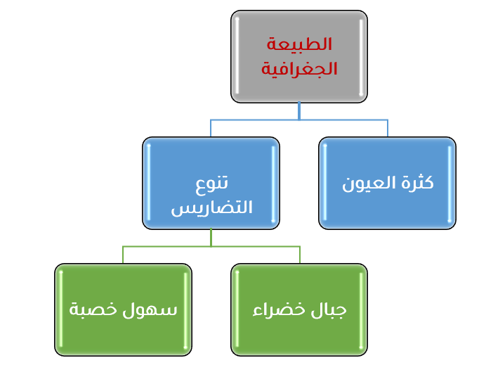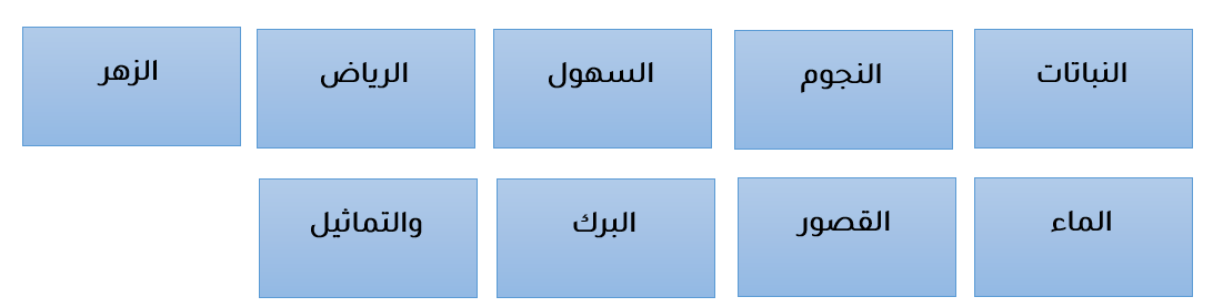 الحدائق المزهرة، البساتين المثمرة، المصايف والنسائم العليلة، والمدن العامرة والقلاع والطرق المرصوفة.