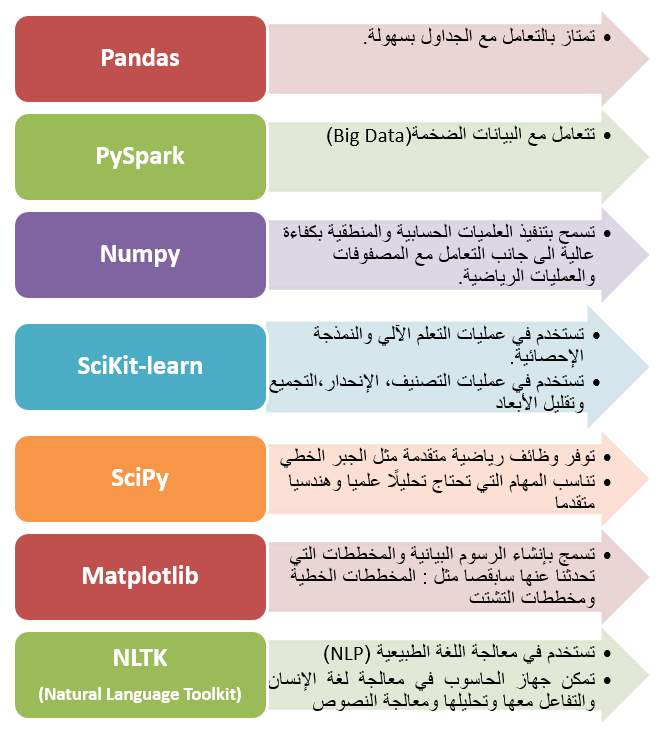 ويمثل الشكل التالي أبرز المكتبات التي توفرها لغة البرمجة بايثون وتساعد في تحليل البيانات: