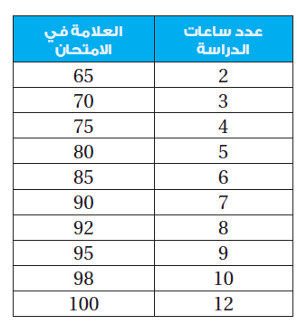 هنا لابدّ من اعتماد اسلوب واختيار أداة من أدوات جمع البيانات لمعرفة عدد ساعات دراسة مجموعة من الطلبة وعلاماتهم في الامتحان ومن ثم تفريغ هذه البيانات في جدول لغايات تحليليها فيما بعد، تمامًا مثل الجدول التالي: