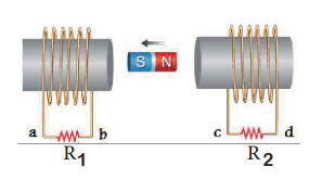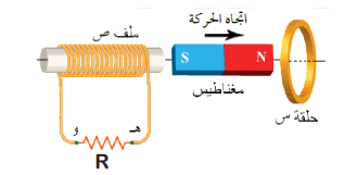 16- في الشكل المجاور معتمدا على المعلومات الواردة فيه , أثناء حركة المغناطيس نحو اليسار يكون اتجاه التيار الحثي في المقاومتين على الترتيب