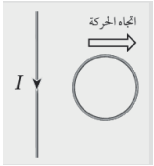 18- في الشكل المجاور سلك مستقيم وحلقة دائرية تقعان على مستوى الورقة , يسري في السلك المستقيم تيار كهربائي للأسفل كما هو مبين في الشكل , أثناء تحريك الحلقة نحو اليمين فإن التيار الكهربائي المتولد في الحلقة يكون