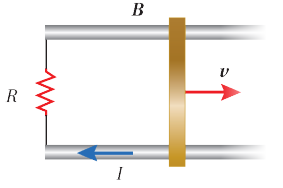 19- موصل مستقيم طوله مغمور داخل مجا مغناطيسي منتظم . عند سحب الموصل بسرعة ثابته مقدارها على مجرى فلزي باتجاه محور يمر في المقاومة R تيار حثي بالإتجاه المبين في الشكل . إن مقدار المجال المغناطيسي واتجاهه