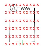 1- في الشكل المجاور , دارة كهربائية بسيطة رباعية الشكل مساحتها مكونة من مقاومة وبطارية مهملة المقاومة الداخلية , غمرت كليا في مجال مغناطيسي B . اذا تناقص المجال المغناطيسي بمعدل , فإن قراءة الأميتر بوحدة الأمبير تساوي