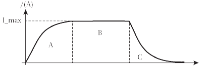 20- يبين الشكل التمثيل البياني لعلاقة التيار الكهربائي والزمن لدارة تتكون من محث ومقاومة وبطارية . العبارة التي تصف التدفق المغناطيسي والقوة الدافعة الكهربائية الحثية في الفترة B