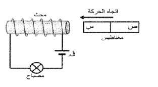4- في أثناء إقتراب مغناطيس من دارة كهربائية مغلقة كما في الشكل المجاور , فإن إضاءة المصباح