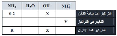 * ادرس الجدول أدناه المتعلق بتأين الأمونيا في الماء وفق المعادلة الآتية: NH3 + H2O OH- +NH4+ثم أجب عن الفقرتين (16 , 15)