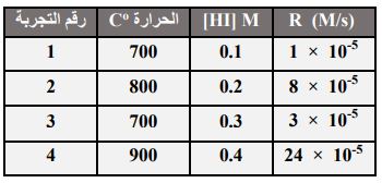 45- الجدول الآتي يمثل تفكك غاز HI، فإن قانون سرعة التفاعل هو: