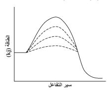 84- الشكل المجاور يمثل منحنيات الطاقة لتفاعل معين بوجود ثلاثة عوامل مساعدة وكانت طاقة التنشيط المقاسة كما يلي: 105 / 55 / 75 /90) kj، فإن قيمة طاقة التنشيط بدون عامل مساعد تساوي (kj):