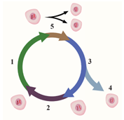 12- ادرس الشكل المجاور الذي يمثل دورة الخلية ما اسم الطور في المرحلة البينية الذي يشير اليه كل من الارقام الاتية 1 / 2 / 3 / 4 بالترتيب