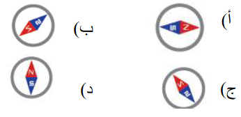 21- يوضح الشكل المجاور مغناطيس مستقيم وضعت فوقه بوصلة، إن الشكل الصحيح الذي يمثل البوصلة مما يلي هو