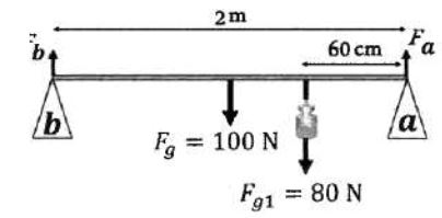 7- ساق فلزية منتظمة طولها (m 2) ووزنها ( N 100) والذي يؤثر في منتصفها ومثبتة على نقطتي الارتكاز (a,b) علّق في الساق جسم وزنه ( N8) على بعد (cm60) من نقطة الارتكاز (a) كما في الشكل المجاور. وكانت الساق في وضع اتزان سكوني فإنّ القوتين اللتين تؤثر فيهما نقطتا الارتكاز (a) و (b) في الساق بوحدة نيوتن (N) هما :
