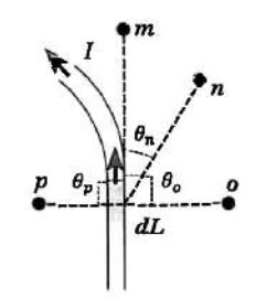 .22يبين الشكل المجاور موصلا يسري فيه تيار كهربائي، والنقاط (m , n , o , p )تقع بالقرب من الموصل، إذا كانت (dL) قطعة من الموصل، فإنّ النقطة التي لا ينشأ عندها مجال مغناطيسي من القطعة (dL)، هي: