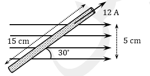 21- في الشكل المجاور موصل مستقيم طوله يحمل تياراً شدته فاذا كان سمك منطقة المجال المغناطيسي وقيمته فان القوة المغناطيسية المؤثرة في الموصل من المجال المغناطيسي تساوي