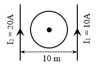 22- ملف دائري عدد لفاته لفات ونصف قطره موضوع في منتصف المسافة بين موصلين كما في الشكل. فان مقدار واتجاه التيار الذي يجب ان يمر في الملف حتى تصبح شدة المجال المغناطيسي في مركزه بعيداً عن الناظر بوحدة الامبير يساوي