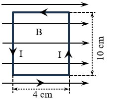 24- حلقة مستطيلة الشكل يسري فيها تيار موضوعة داخل مجال مغناطيسي منتظم مقداره , كما في الشكل المجاور. فان مقدار عزم الازدواج الذي يؤثر به المجال المغناطيسي في الحلقة بوحدة يساوي