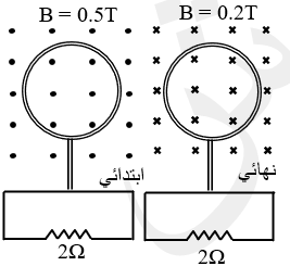 27- يبين الشكل المجاور ملفاً دائرياً مساحة مقطعه العرضي وعدد لفاته لفة، موصول بطرفي مقاومة مقدارها , وموضوع في مستوى عمودي على مجال مغناطيسي منتظم باتجاه الناظر، اذا انعكس اتجاه المجال المغناطيسي وتغيرات قيمته الى خلال زمن مقداره )، فان مقدار التيار الكهربائي الحثي المار بالمقاومة بوحدة الاوم يساوي