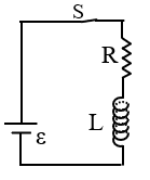 31- الشكل المجاور يوضح دارة كهربائية تحوي بطارية ومقاومة ومحث معامل الحث الذاتي له يسري فيه تيار كهربائي . اذا عُكس اتجاه التيار المار في المحث خلال فترة زمنية , فان القوة الدافعة الكهربائية الحثية الذاتية المتوسطة المتولدة فيه تساوي