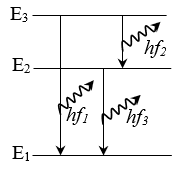 41- في الشكل المجاور ثلاث انتقالات لالكترون ذرة هيدروجين.عند مقارنة تردد الفوتون المنبعث في كل من الانتقالات الثلاث، فان