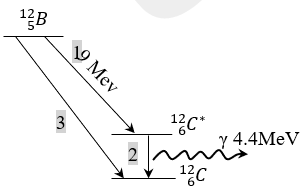 46- يوضح الرسم التخطيطي المجاور اضمحلال نواة بورن الى نواة كربون بطريقتين مختلفتين، اعتماداً على البيانات المثبتة على الرسم ، فان نوع الجسيم المنبعث في الاضمحلال المشاراليه بالرقم وطاقته بوحدة