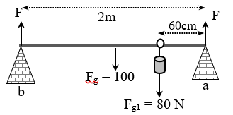 9- ساق فلزية منتظمة طولها ووزنها والذي يؤثر في منتصفها ومثبتة على نقطتي الارتكاز . عُلق في الساق جسم وزنه على بُعد من نقطة الارتكاز كما في الشكل المجاور. وكانت الساق في وضع اتزان سكوني. فان القوتين اللتين تؤثر فيهما نقطتا الارتكاز (a) و (b) في الساق بوحدة انيوتن هما
