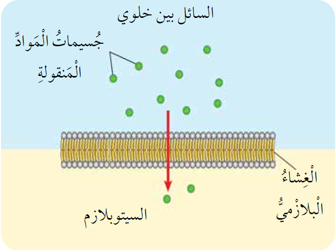 يمثل الشكل الآتي إحدى طرق نقل المواد في الخلية الحية من دون الحاجة إلى طاقة، وهي......